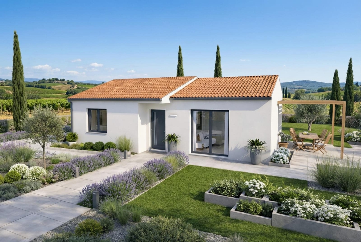Cette maison neuve est basse consommation et conforme à la RE2020, garantissant une efficacité énergétique optimale. Les options les plus demandées par nos clients incluent l'enduit bi-ton, les menuiseries en aluminium, un carport et un poêle à pellets, pour un confort et une esthétique supplémentaires.