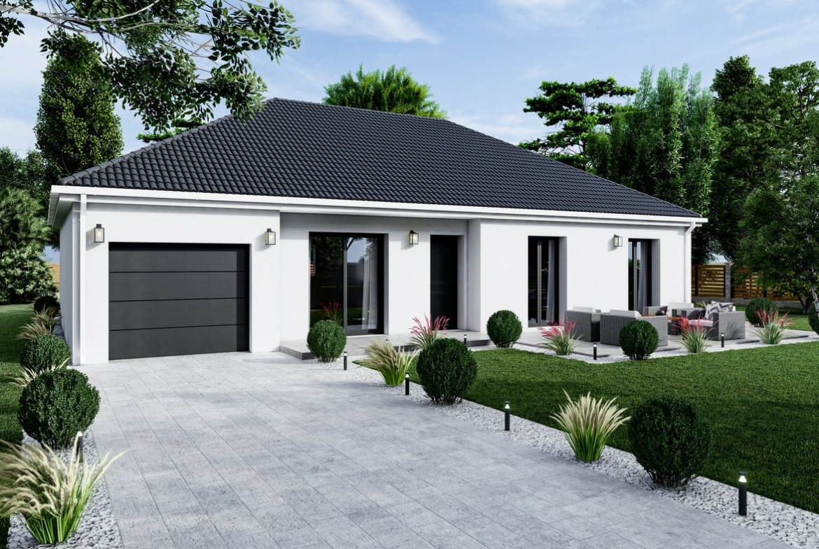 Cette maison de plain-pied se distingue par son design soigné, avec un porche accueillant qui rompt l'uniformité de la façade, offrant un abri de seuil de porte des plus pratiques. Le garage intégré ajoute une commodité non négligeable, facilitant votre quotidien tout en s'intégrant harmonieusement à l'ensemble architectural.
